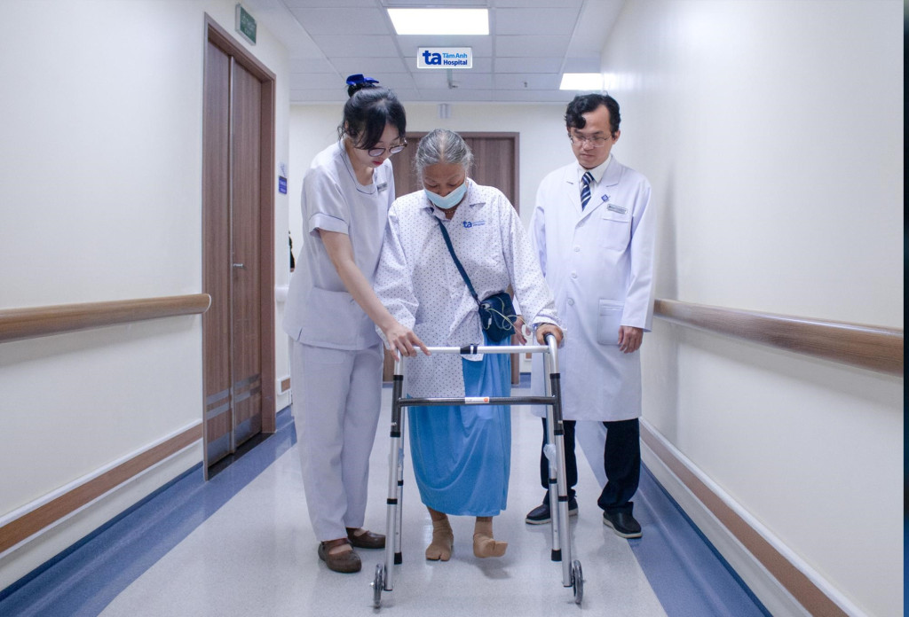 Bà Hồng tập đi lại ngay sau phẫu thuật thay khớp gối bằng Robot AI CUVIS-Joint (Ảnh: BVĐK Tâm Anh)