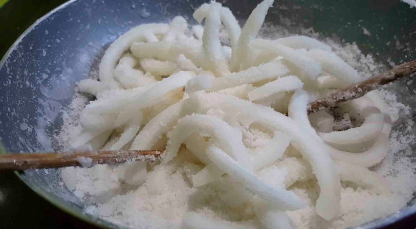 Về nguyên liệu, bạn chỉ cần chuẩn bị khoảng 500 g cùi dừa non và 500 g đường trắng. Khi tách cùi dừa, nên chọn loại non vừa, dùng tay ấn thử thấy còn độ mềm nhưng không quá nhão. Dừa quá non sẽ nhiều nước, khó kết tinh đường,