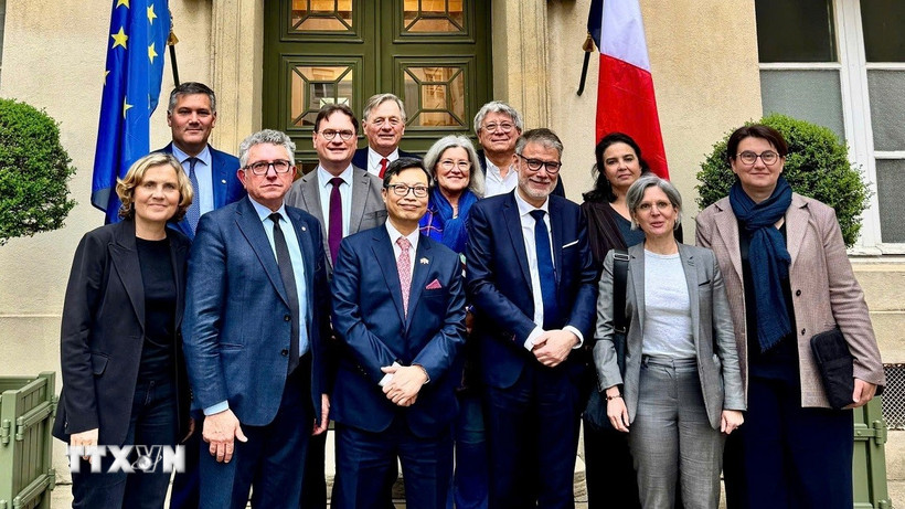 Đại sứ Việt Nam Trịnh Đức Hải và Chủ tịch Nhóm Nghị sỹ hữu nghị Pháp-Việt Nam Michel Criaud (hàng đầu, thứ ba từ phải sang). (Ảnh: TTXVN phát)
