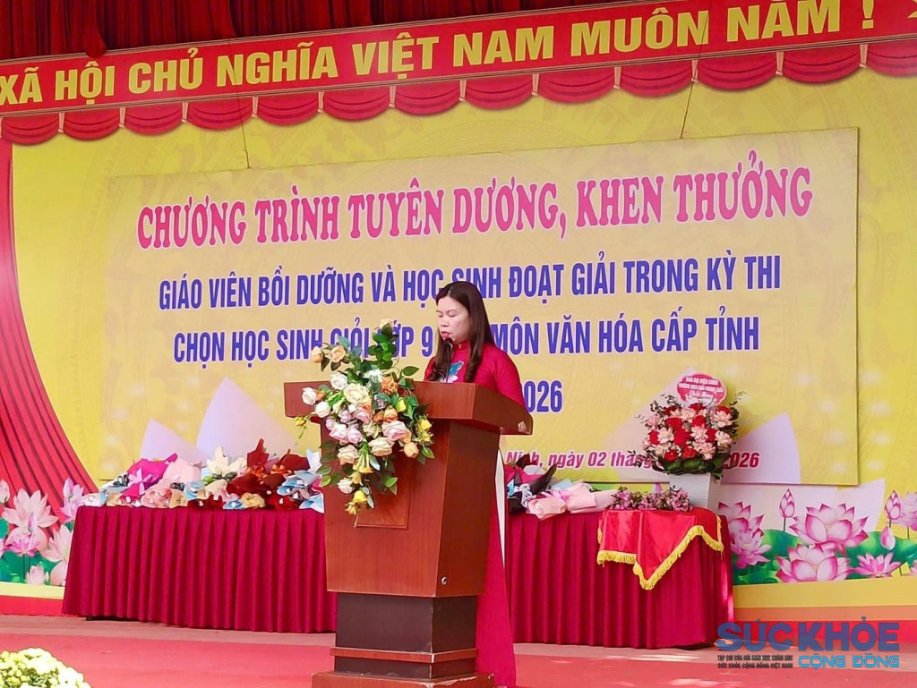 Bà Nguyễn Thị Huế, Bí thư Chi bộ, Hiệu trưởng Trường THCS Giấy Phong Châu, phát biểu chúc mừng 52 học sinh lớp 9 đạt thành tích cao trong kỳ thi học sinh giỏi cấp tỉnh (ảnh: TL)