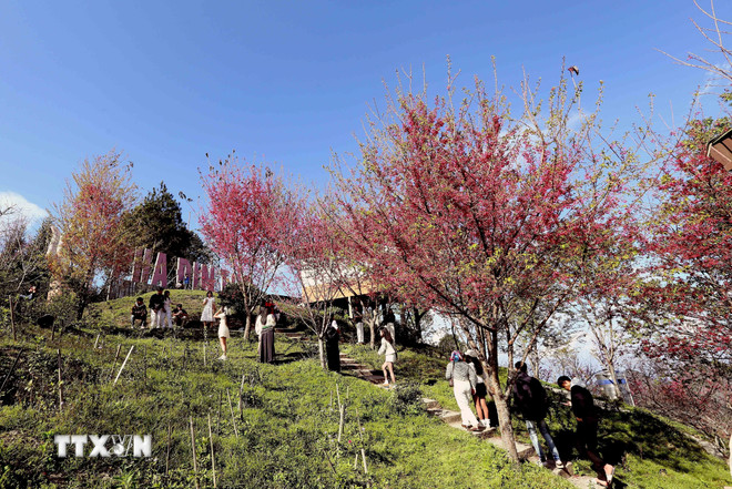 Du khách chụp ảnh với hoa mai anh đào tại khu du lịch Pha Đin Top, tỉnh Sơn La. (Ảnh: Quang Quyết/TTXVN)