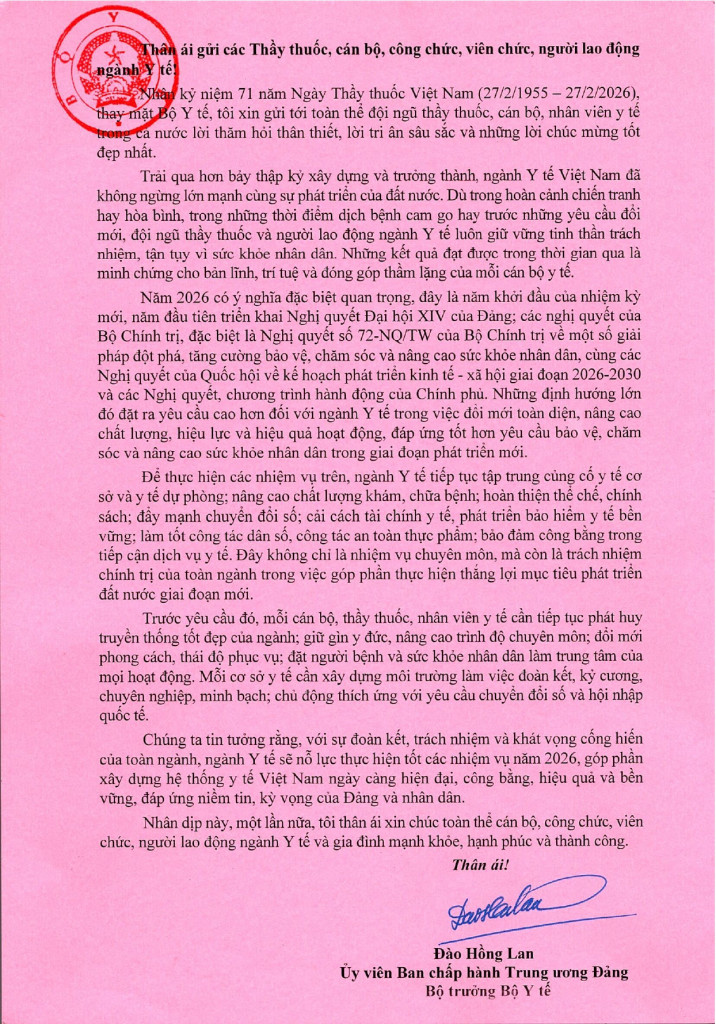 Nhân kỷ niệm 71 năm Ngày Thầy thuốc Việt Nam (27/2/1955 – 27/2/2026), thay mặt Bộ Y tế, tôi xin gửi tới toàn thể đội ngũ thầy thuốc, cán bộ, nhân viên y tế trong cả nước lời thăm hỏi thân thiết, lời tri ân sâu sắc và những lời chúc mừng tốt đẹp nhất.