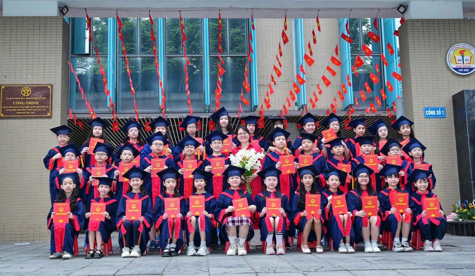 Cô giáo Đinh Thị Minh Huệ cùng các em học sinh.