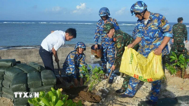Vun trồng cây xanh ở Trường Sa. (Ảnh: TTXVN phát)