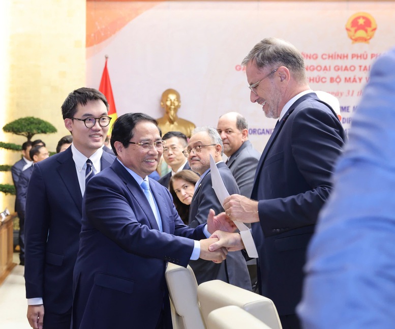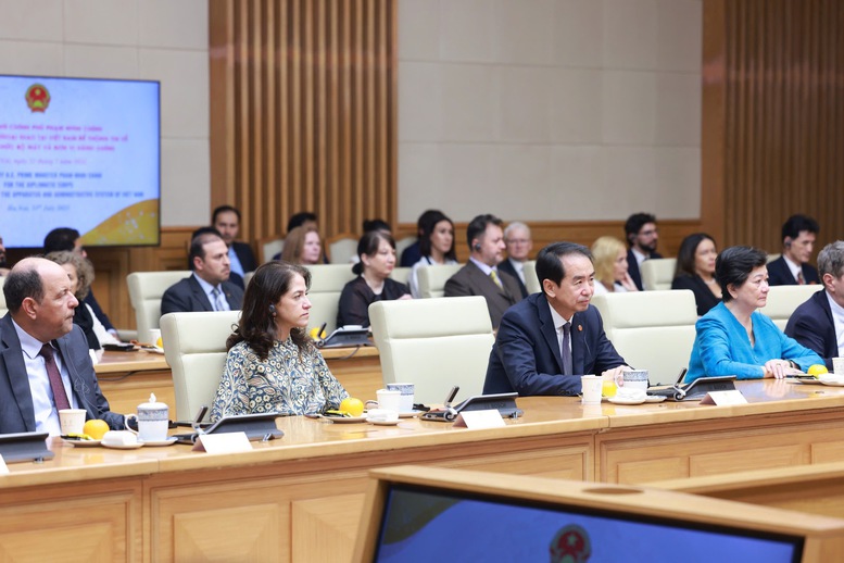 Thủ tướng Phạm Minh Chính chủ trì gặp mặt Đoàn Ngoại giao tại Việt Nam để thông tin về sắp xếp tổ chức bộ máy, đơn vị hành chính và tổ chức chính quyền địa phương 2 cấp của Việt Nam - Ảnh: VGP/Nhật Bắc