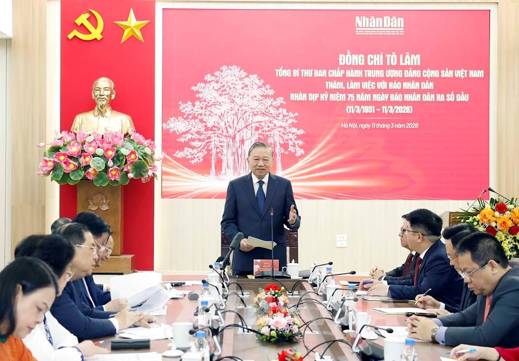 Phát biểu chỉ đạo tại buổi lễ, Tổng Bí thư Tô Lâm cho biết, trong hơn 7 thập kỷ qua, kế tục sự nghiệp vẻ vang của các tờ báo Thanh Niên, Tranh Đấu, Cờ Giải phóng, Sự Thật, trải qua các chặng đường lịch sử đầy thử thách, Báo Nhân Dân đã không ngừng phát triển và trưởng thành, luôn giữ vững vai trò là vũ khí tư tưởng sắc bén của Đảng; là phương tiện thông tin tuyên truyền hữu hiệu của các cấp ủy và chính quyền; là diễn đàn tin cậy của đảng viên và nhân dân; luôn hoàn thành xuất sắc sứ mệnh cơ quan Trung ương của Đảng Cộng sản Việt Nam, tiếng nói của Đảng, Nhà nước và Nhân dân Việt Nam, góp phần củng cố niềm tin xã hội, tạo sự thống nhất về nhận thức và hành động trong toàn Đảng, toàn dân, toàn quân ta.